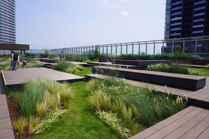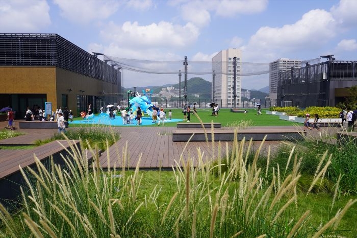 「ソラモア広場」には、ウッドデッキのほか、屋上緑化が施されています。
