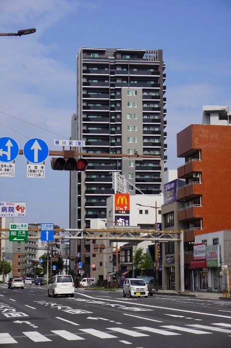 Theフローレンス横川駅前タワーレジデンスは、広島県広島市西区横川町三丁目に建つ地上19階、地下1階、高さ59.63m、総戸数58戸の高層タワー型マンションです。立地はJR、広島電鉄「横川」駅の南東側、城北通りと可部街道の交わる横川3丁目交差点南東側、「フローレンス横川駅前Premium Stage」の西側隣接地に位置しています。