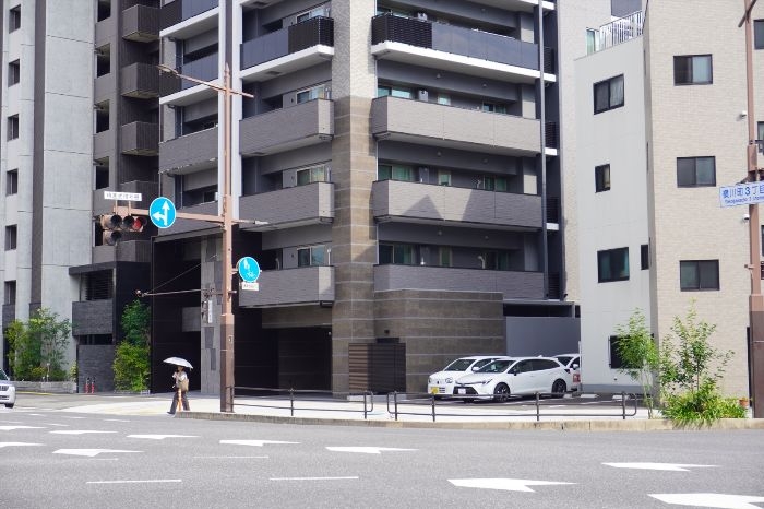 北西側から見たTheフローレンス横川駅前タワーレジデンスの低層部分の様子です。