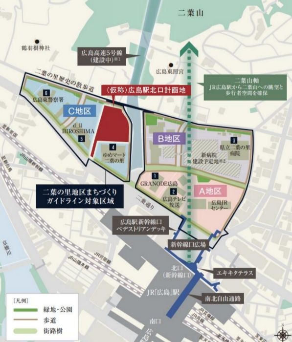 (仮称)広島駅北口計画は、広島県広島市東区二葉の里に建設される地上31階、高さ124.00m、総戸数287戸の超高層複合タワーマンションです。立地は、広島駅北西側の二葉の里地区、南側を二葉通り、北側から東側を二葉の歴史の散歩道に面した「二葉の里地区2街区」に位置しています。当初は2013年に一般競争入札で落札した「イケア・ジャパン」が店舗を建設する予定でしたが、2021年に断念し、住友不動産に売却されていました。