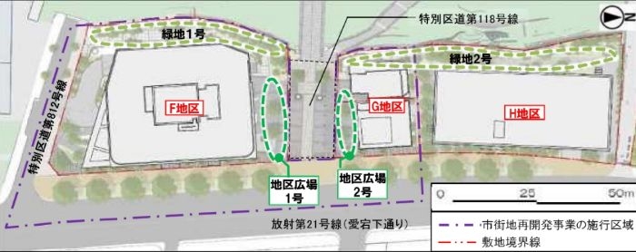 本事業では、建築物の整備に加え、都市基盤の強化にも重点が置かれています。放射第21号線(愛宕下通り)の拡幅整備を行うことで交通の円滑化を図り、歩行者にとって快適な空間を形成します。また、区道812号線や愛宕神社参道などの電線地中化により、安全性と景観性を高め、防災機能の向上に寄与します。