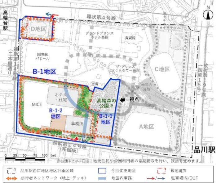 区域内にはグランドプリンスホテル新高輪があり、建築から40年以上が経過し更新が必要とされているほか、周辺の歩行環境には急勾配や歩道の狭さといったバリアフリーや安全性の面で課題を抱えています。計画では、進行中の「(仮称)品川駅西口地区A地区新築計画」と連携し、駅と街をつなぐネットワークを形成するとともに、隣接する高輪森の公園やホテルの緑地と一体化した整備が行われます。さらに、MICEや宿泊機能を活かしつつ、業務・商業・居住機能を導入し、多様なにぎわいと交流を生む土地利用を推進することで、「日本の成長を牽引する国際交流拠点・品川」の形成を目指すものとされています。