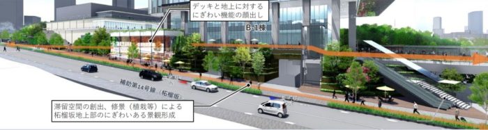 また、柘榴坂沿いには、歩いて楽しい坂道景観を形成し、デッキレベルを活かした視覚的なにぎわいと開放感を演出。二本榎通り沿いでは、潤いと憩いを感じられる緑豊かな沿道景観が整備され、周辺との連続性と快適性が高められます。