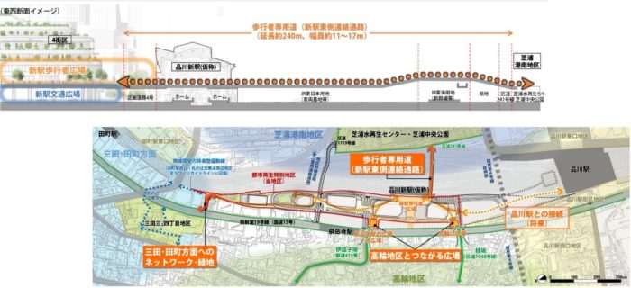 高輪築堤の保存と活用を通じて、日本初の鉄道開業地としての歴史的価値を未来へ継承し、「国際交流拠点・品川」の実現に向けた地域価値向上を目指すものとされています。2027年度には、国指定史跡である第7橋梁部や公園部の現地保存・公開をし、当時の景観を再現する展示も行われます。まちびらきに合わせた高輪リンクラインの整備や、AR技術を使った「TAKANAWA LINK SCAPE」体験で、歴史を実感できる空間の創出もなされます。また、第7橋梁部周辺の広場や(仮称)築堤ギャラリーを開設し、鉄道や日本近代化の歴史が紹介されます。