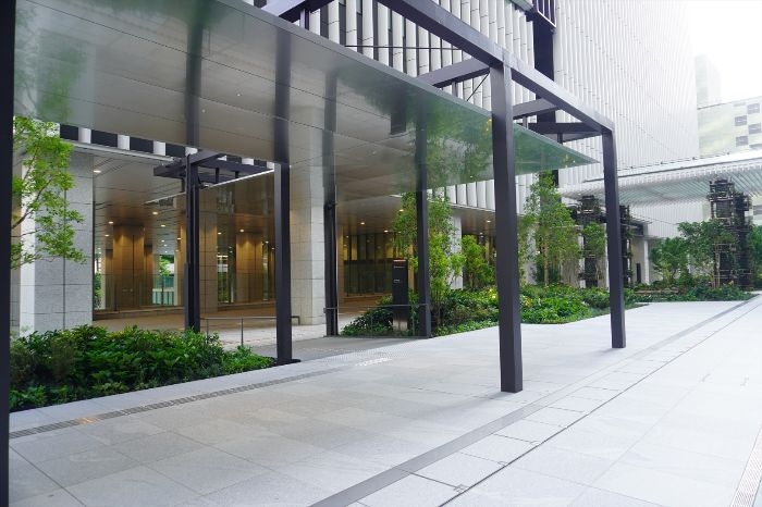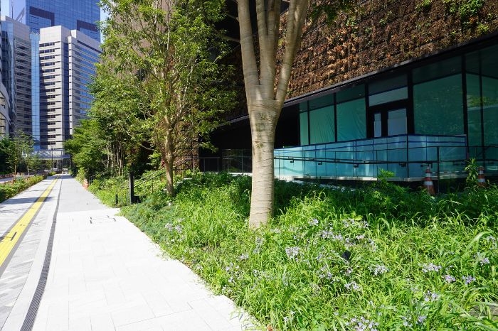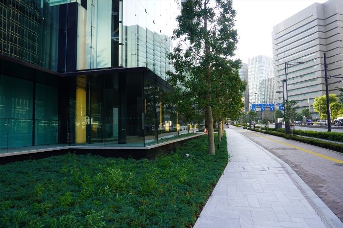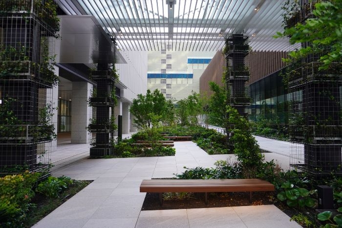 これにより、都市の喧騒の中でも自然を身近に感じられる環境が提供され、来訪者や働く人々がリラックスできる空間としての魅力が高められています。緑道と敷地内の緑地が一体となることで、歩行者の動線に沿った心地よい景観と潤いのある街並みが形成され、周辺の都市環境にも寄与しています。