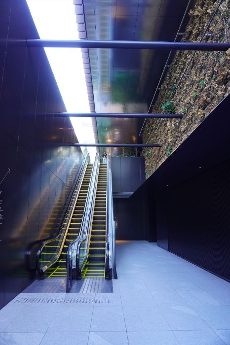 エントランスラウンジからオフィスロビーへ至るエスカレーターと吹き抜け空間の様子です。