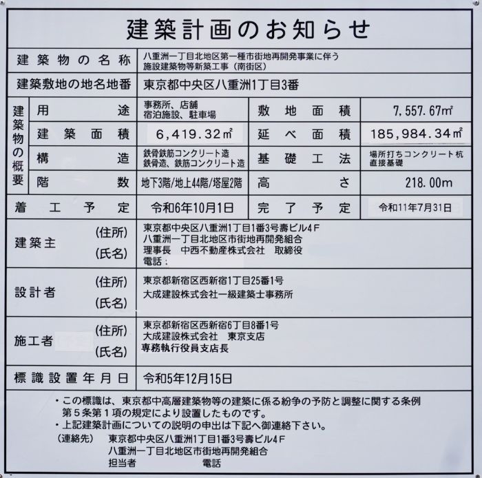 建築主は八重洲一丁目北地区市街地再開発組合、特定業務代行者および参加組合員は東京建物株式会社、東京ガス不動産株式会社、大成建設株式会社、明治安田生命保険相互会社、設計は基本設計が株式会社日本設計、実施設計が大成建設株式会社、施工は大成建設株式会社です。既存建築物の解体、除去は2023年5月8日、着工は南街区が2024年10月1日、北街区が2031年度、竣工は南街区が2029年7月31日、北街区が2032年2月となっています。