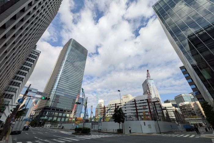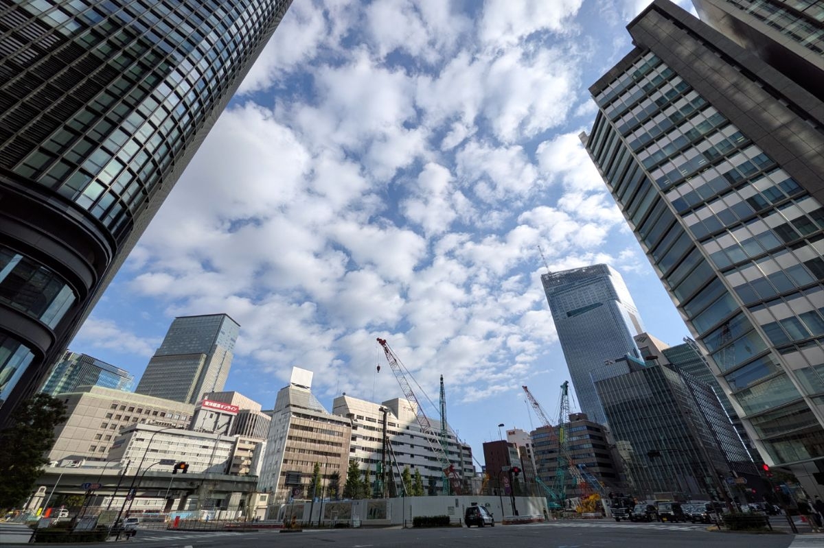 西側から見た建設中の八重洲一丁目北地区第一種市街地再開発事業 南街区の様子です。東側には、日本橋の超高層ビル群が広がっており、八重洲と丸の内・大手町、日本橋エリアを繋ぐ再開発となっています。