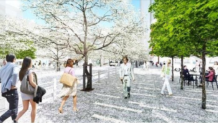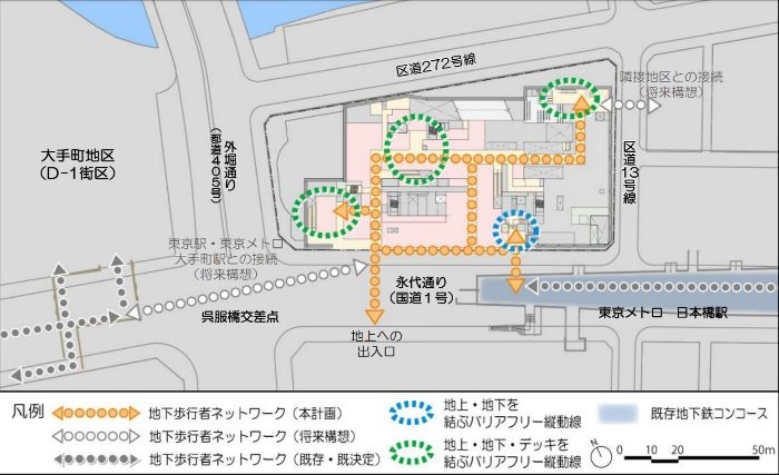 また、地上・地下・デッキレベルを結ぶ多層的な歩行者ネットワークを形成し、呉服橋交差点直下の地下通路を整備することで、地下通路を通じて東京駅、日本橋駅、大手町駅、京橋駅との接続性を高め、回遊性や交流の拠点を提供します。さらに、南北街区間の区道272号線や東側の区道13号線の再整備を行い、交通と歩行者の双方に配慮した都市基盤整備を推進します。