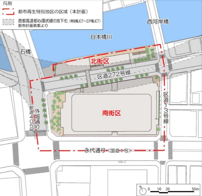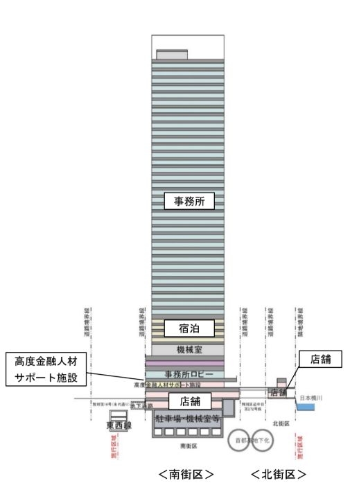 再開発事業による土地の合理的かつ健全な高度利用と都市機能の更新を図り、日本橋川沿いの水辺再生と歩行者ネットワークの整備や国際競争力の強化に資する金融拠点の形成、環境負荷低減と防災対応力強化がなされます。施設構成は、「南街区」の地下3階~地下2階に駐車場、機械室等、地下1階に地下通路、地下1階~地上2階に店舗、高度金融人材サポート施設、寺院、事務所、3階に事務所ロビー、4階に事務所、5階に機械室、6階~9階に宿泊施設、10階~44階に事務所、「北街区」の地上1階~2階に店舗となります。