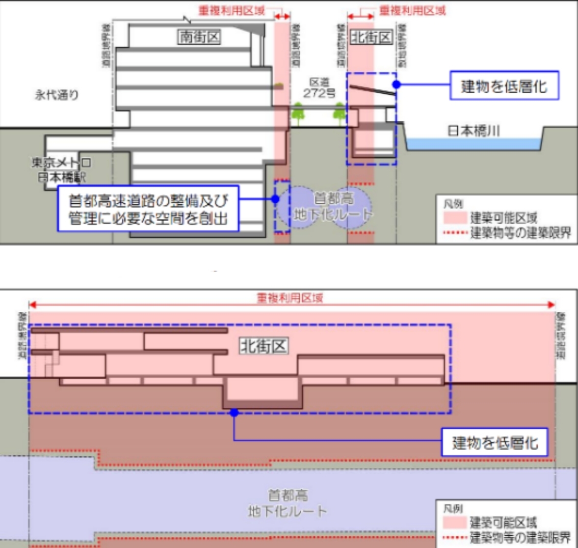 「首都高地下化の実現に向けた協力」の断面イメージです。北街区では首都高地下化ルートを考慮した構造形式、荷重条件とするため、建物を低層化し、南街区では地下に首都高速道路の整備及び管理に必要な空間を創出するものとされています。
