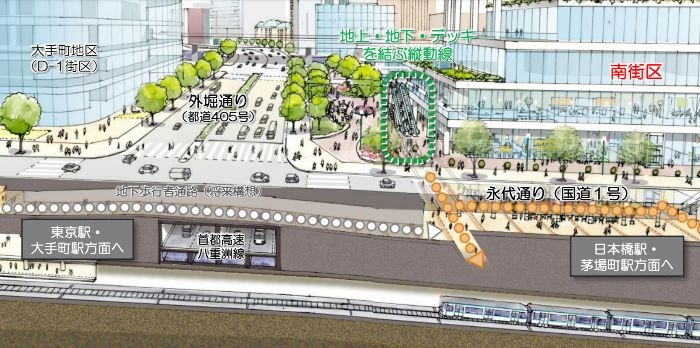 呉服橋交差点直下には、地下歩行者通路を整備する構想が進められています。この地下通路が実現すると、丸の内や大手町、八重洲、日比谷方面の地下通路網と日本橋の地下通路網が接続されます。