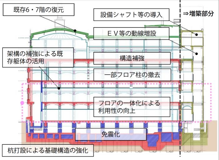 日本橋川沿いの整備では、歴史的建造物の保存・活用と水辺環境の魅力向上を両立させることを目指したものとなります。旧館や本館の外壁を保存し、既存6・7階の復元や免震化、フロアの一体化を行うことで景観の風格を保ちながら、動線整備によって利便性向上が図られます。