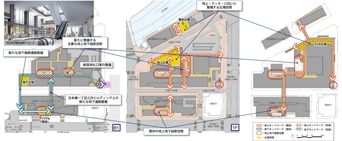 地下1階レベルで都営浅草線「日本橋」駅と直結する計画となっています。