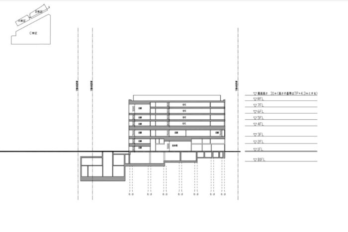 B街区は、地上7階、地下2階、高さ31.62mの商業施設や住宅から構成される中層ビルとなります。