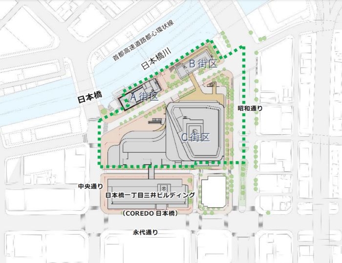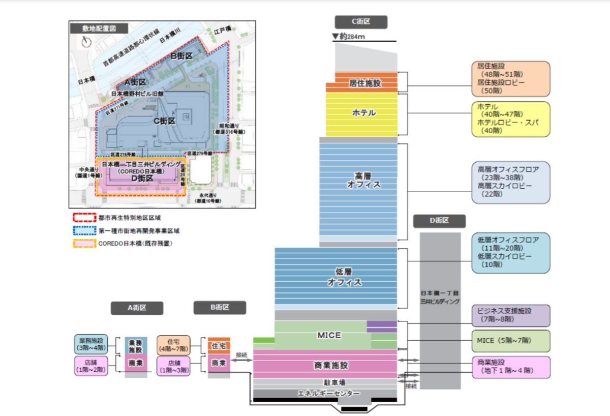 地下1階~4階は商業施設となり、にぎわいの軸となる商業ゾーンを形成するほか、隣接するD街区「日本橋一丁目三井ビルディング/COREDO 日本橋」とは地上3階、地下1階にて新たな連絡通路の接続と、D街区内の改修工事が行われ、既存商業施設とも融合した新たな商業空間を創出するものとされています。