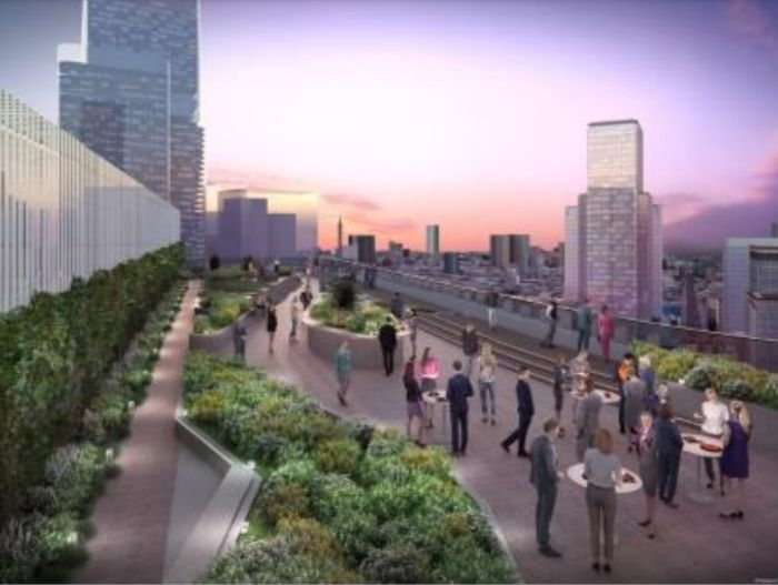 C街区は、エリア最大級のオフィスフロアとなるオフィスが入ります。10階~20階は基準階面積約1,900坪、22階~38階は基準階面積約1,300坪となり、10階と22階には屋外スカイガーデンが配置されます。
