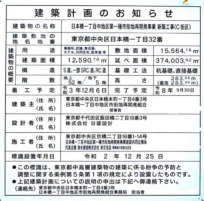 日本橋一丁目中地区第一種市街地再開発事業は、東京都中央区日本橋一丁目で建設中の地上4階、地下1階、高さ約32mの「A街区」、地上7階、地下2階、高さ31.62mの「B街区」、地上52階、地下5階、高さ283.96mの「C街区」から構成される超高層ビルです。立地は、東京メトロ・都営地下鉄「日本橋」駅至近、西側を中央通り、東側を昭和通り、北側を日本橋川に囲まれた一帯に建っていた「日本橋御幸ビル」や「日本橋西川ビル」、「COREDO日本橋ANNEX」、「江戸橋ビル」、「第二江戸橋ビル」、「野村証券本社本館、別館」など27棟の既存建築物の跡地に位置しています。
