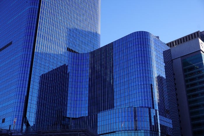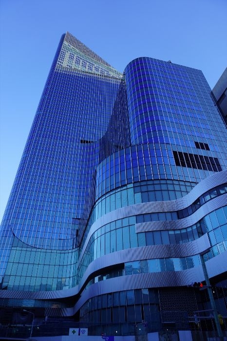 低層部分は、アールを描いたガラスカーテンウォールの外観ファサードが特徴となっています。