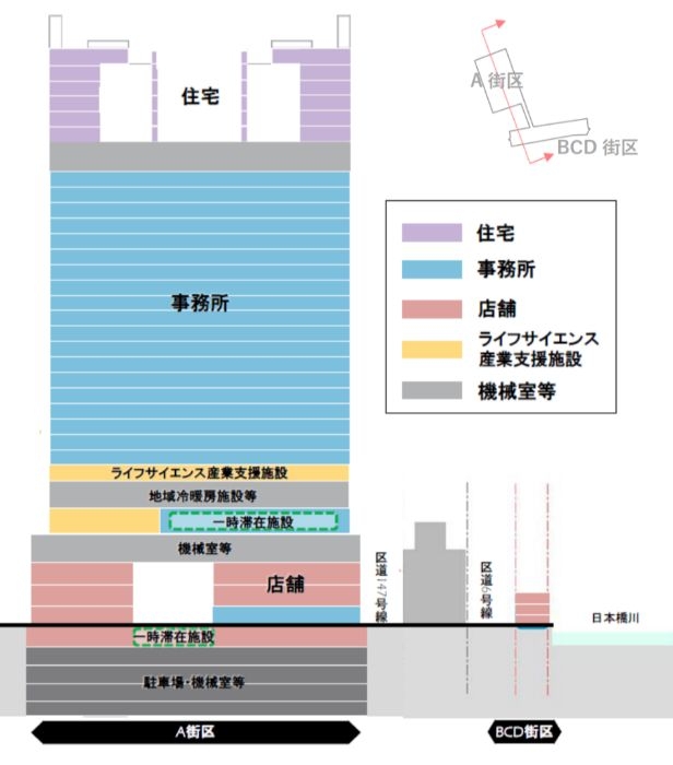 棟配置は、北側に地上34階、地下4階、高さ172.900mの「A街区」、日本橋川に面して地上3階、高さ約15mの「B街区」、地上1階、高さ4mの「C街区」、地上1階、高さ4mの「D街区」から構成されます。