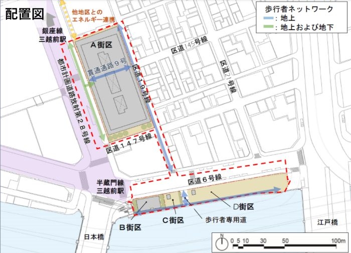 施設構成は、「A街区」の地下4階~地下2階に駐車場、機械室、地下1階~地上1階に店舗、エントランス、2階~3階に店舗、4階に機械室、5階にオフィスロビー、貢献施設、6階に機械室、7階に貢献施設、8階~27階に事務所、28階~33階に総戸数約66戸の住宅、34階に附室・ハト小屋、PH1階~PH2階にEV機械室、「B街区」の1階~2階に店舗、3階に住宅、「C街区」の1階に倉庫、「D街区」の1階に倉庫となります。また、A街区の中央やや北側に幅員約8.0mの貫通通路「むろまち小路」を整備するほか、B街区には歩行者通路29号の一部を整備、C・D街区間には日本橋一丁目中地区方向へ日本橋川上に新設する構想のある人道橋へ通じる新設区道(歩行者専用通路)も整備されます。