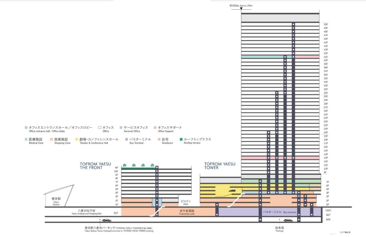 施設構成は、A地区「TOFROM YAESU THE FRONT (トフロム ヤエス ザ フロント)」の地下1階~地上2階に商業施設、3階~10階にオフィスとなります。B地区「TOFROM YAESU TOWER (トフロム ヤエス タワー)」の地下4階に機械室、地下3階に駐車場、地下2階に店舗およびバスターミナル「バスターミナル東京八重洲」第2期エリア、地下1階に駐輪場となります。地上1階~4階に商業施設、住宅エントランス、屋内広場等、3階~6階に劇場・カンファレンスホール、4階にオフィスロビー、6階~7階に医療施設、8階に機械室、9階~50階に事務所、13階にオフィスサポート「Wab.」、41階にオフィスサポート「YAESU SKY LOUNGE」およびサービスオフィス、51階に機械室となります。