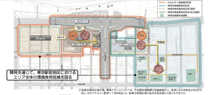 再開発事業に伴い、コージェネレーションシステム(CGS)や非常用発電施設の整備による業務継続機能の強化やCGSの導入や地域冷暖房施設のネットワーク化による環境負荷低減が進められます。