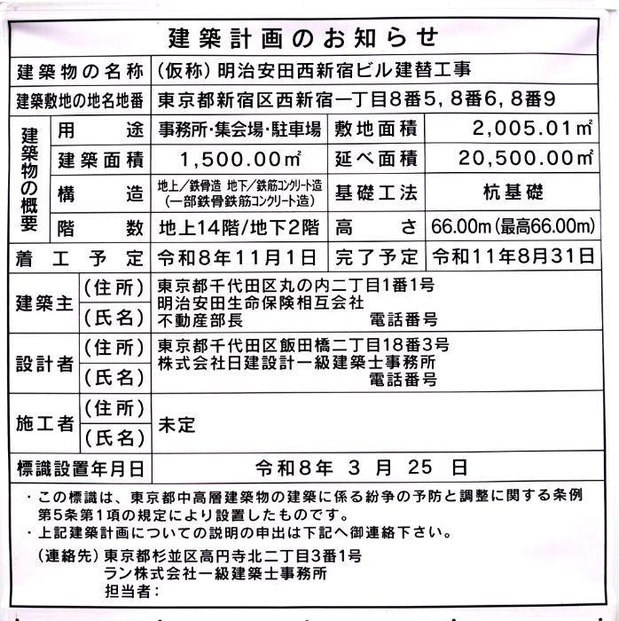(仮称)明治安田西新宿ビル建替工事は、東京都新宿区西新宿一丁目に建設される地上14階、地下2階、高さ66.00mの超高層ビルです。立地は、西側を東京都道新宿副都心八号線、東側を二番街通りに挟まれた場所に建っていた地上10階、地下3階、高さ35.25m、延床面積約22,000㎡の「小田急明治安田生命ビル」跡地に位置しています。