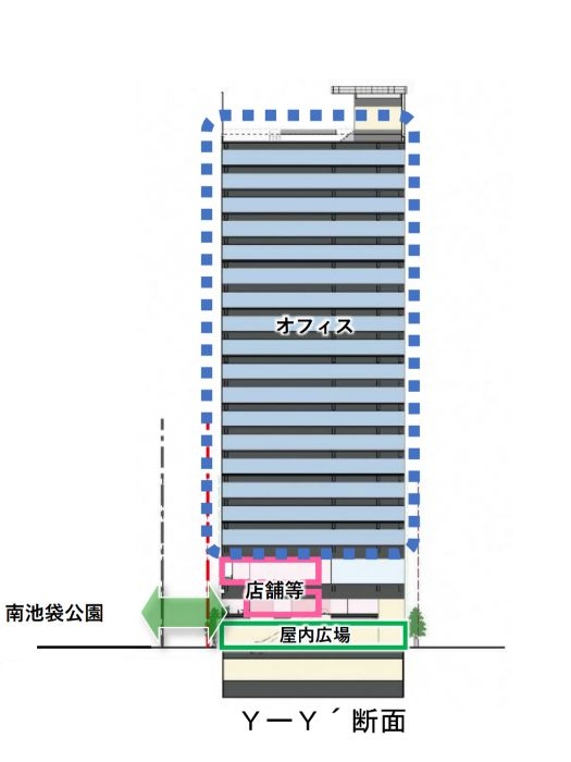 施設構成は、地下1階から地上1階に駐車場、1階から3階に店舗等、4階から20階にオフィスとなります。また、敷地西側に屋外広場、南側の南池袋公園側に屋内広場が設けられます。建築主は南池袋二丁目28番街区地区市街地再開発準備組合、事業協力者は三菱地所株式会社です。着工は2028年度頃、竣工は2031年度末頃となっています。