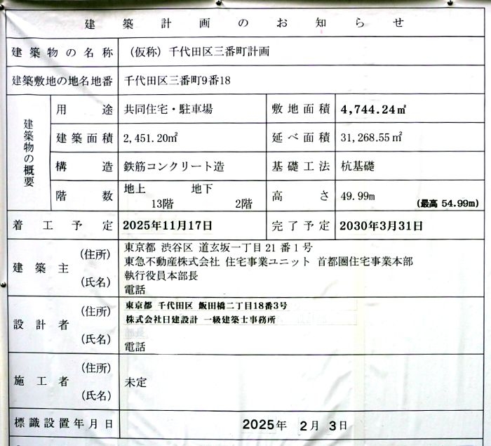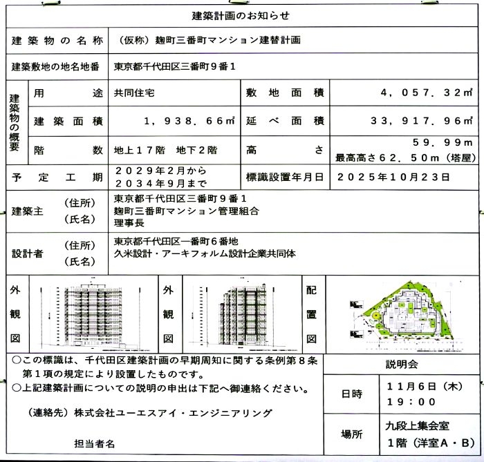 建築主は麹町三番町マンション管理組合、設計は久米設計・アーキフォルム設計企業共同体です。着工は2029年2月、竣工は2034年9月となっています。
