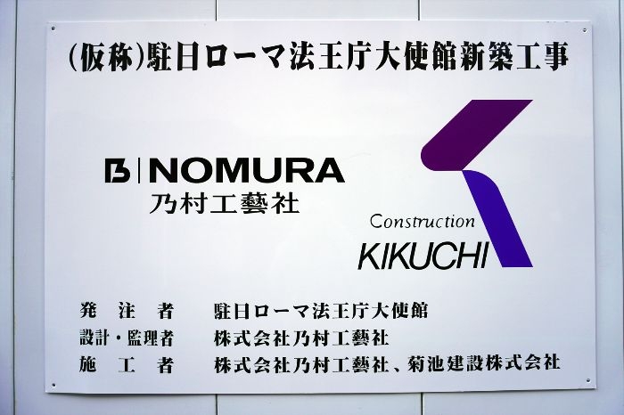 (仮称)千代田区三番町計画と(仮称)駐日ローマ法王庁大使館新築工事の標識です。(仮称)駐日ローマ法王庁大使館新築工事の設計は、乃村工藝社となっています。