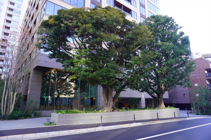 グランドエントランスの前には、約9mのスダジイと約16mのアラカシの既存樹が配置されています。