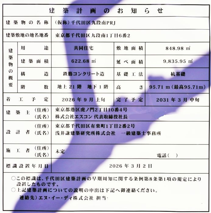 建築主は株式会社エスコン、設計は浅井謙建築研究所株式会社です。着工は2026年9月上旬、竣工は2031年3月中旬となっています。