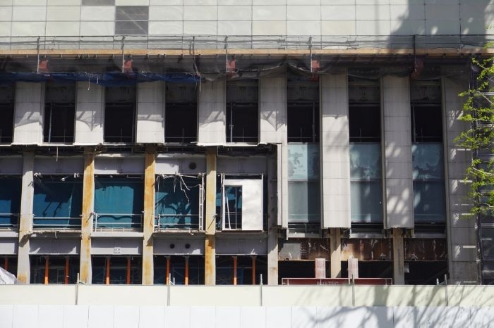 解体工事が進む三菱UFJ銀行本店の低層階もこのように外壁が外され、躯体が露わになっていました。