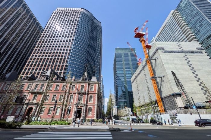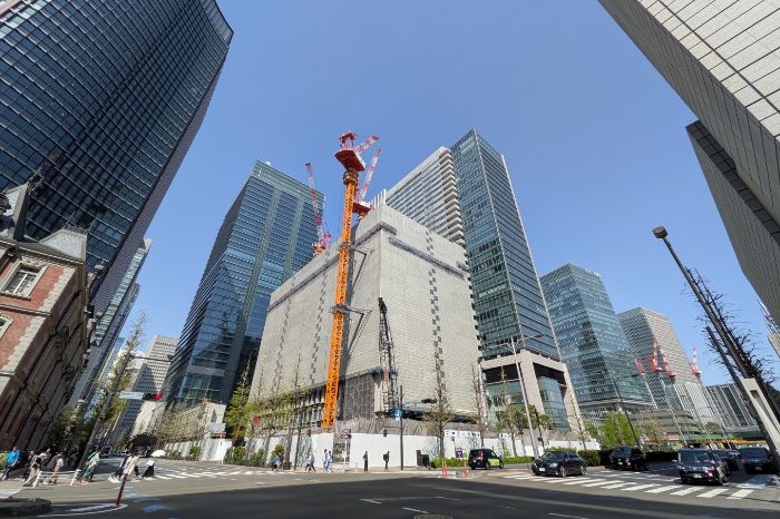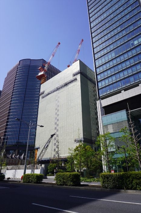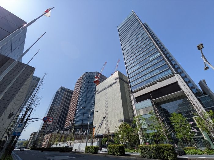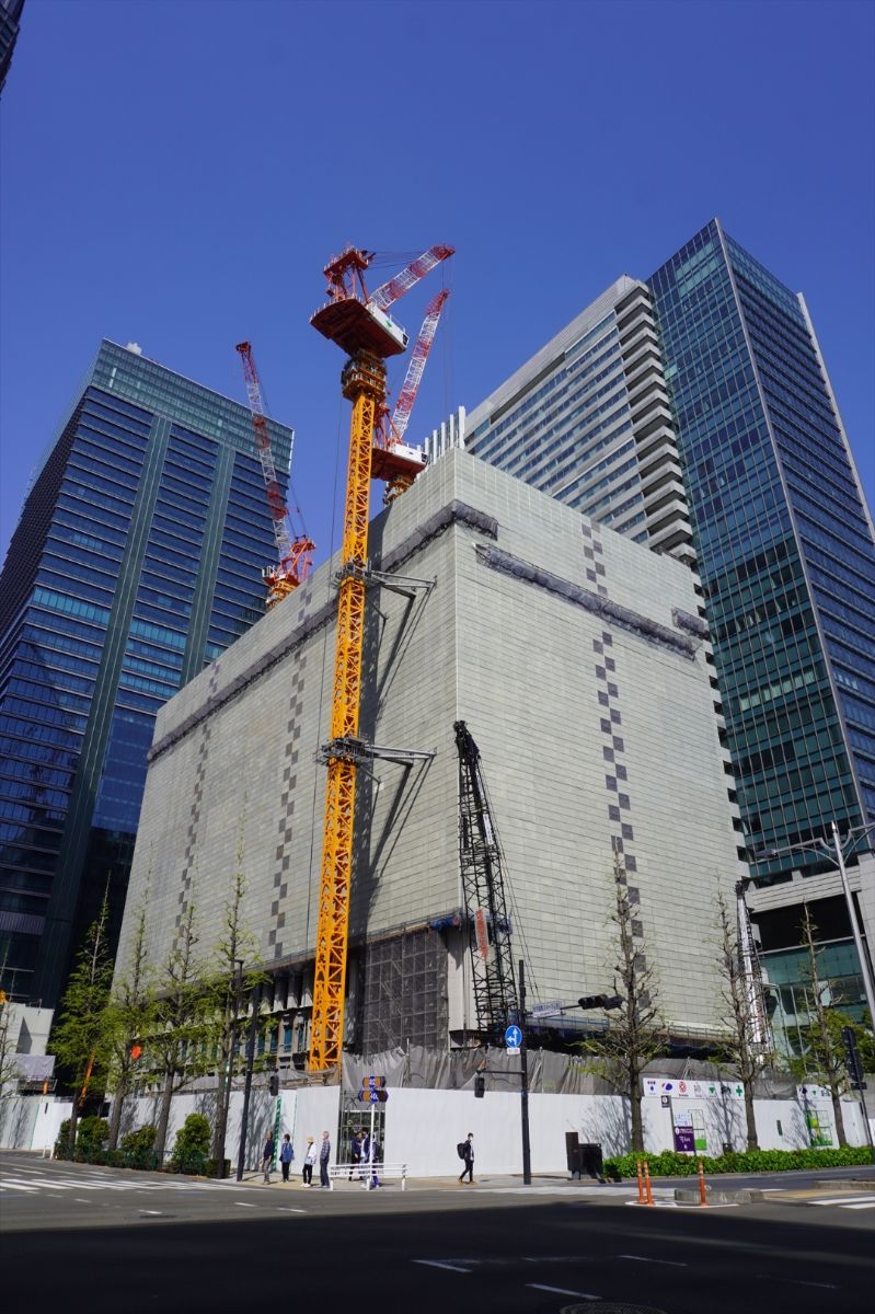 鍛冶橋通り沿いの超高層ビル群と建設中の(仮称)M計画/MUFG 本館の様子です。