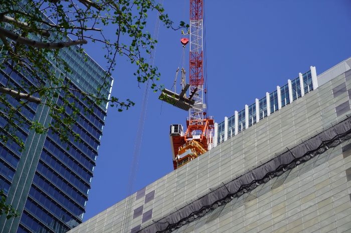 上層階は既に解体が進み、タワークレーンを用いて部材の搬出が進められています。