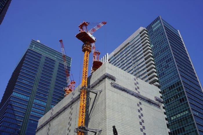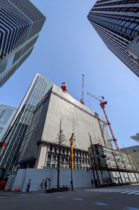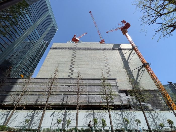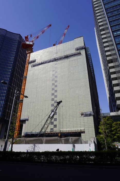 南東側から見た建設中の(仮称)M計画/MUFG 本館の様子です。