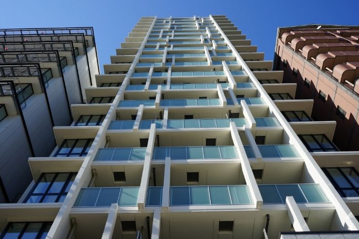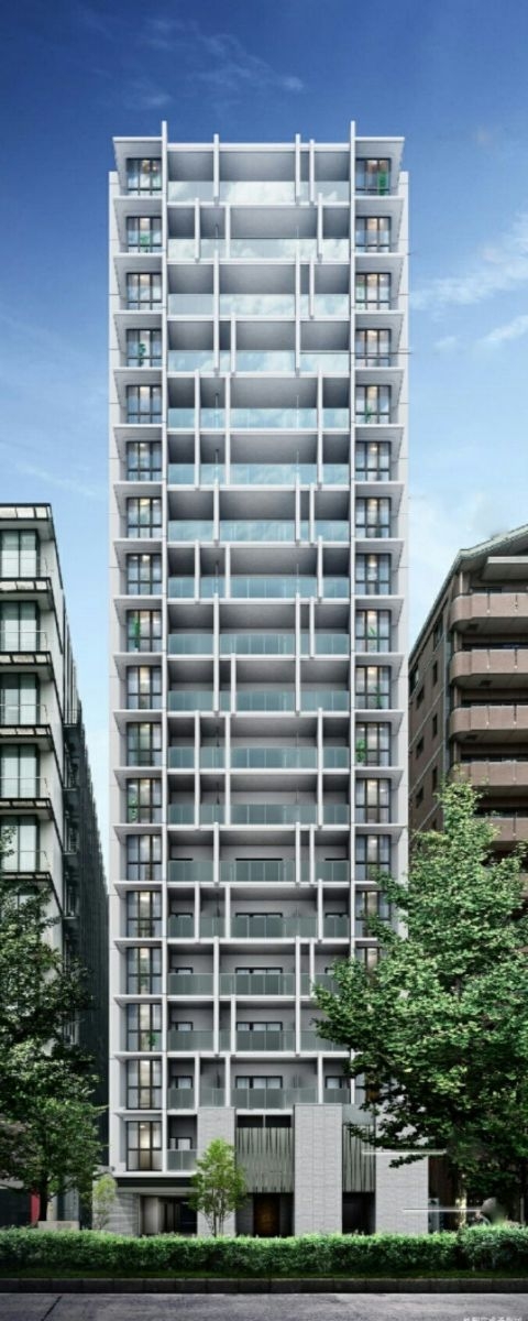 専有面積は41.86㎡~70.38㎡、間取りは1LDK~2LDK、共用施設にはエントランスホール、ラウンジが入ります。細身の外観に、庇やマリオンがダイレクトウインドウや乳白色のガラス手すりといった組み合わせのデザインとなっています。