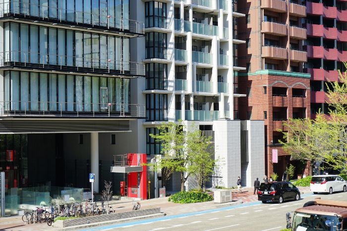 南西側から見たプラウド久屋大通の低層部分の様子です。