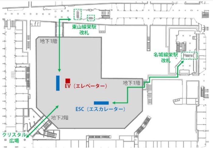 また、久屋大通、広小路通、錦通、大津通の4つの大通りに囲まれた立地特性を活かし、地下鉄各路線や地下街との接続性を高めるアプローチを整備。建物内には複数のエスカレーターやエレベーターを配置することで、地下と地上をバリアフリーで自由に行き来できる快適な歩行空間を実現しています。