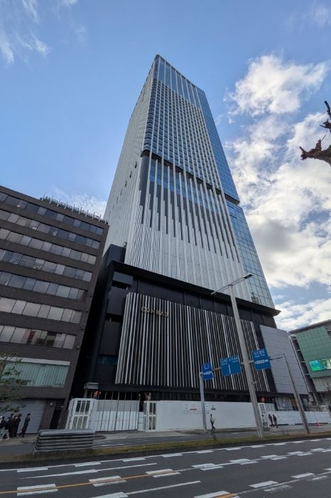 南東側から見た建設中のザ・ランドマーク名古屋栄の様子です。2026年1月時点では、既に上棟しており、外装や外構もほぼ完成しているようでした。