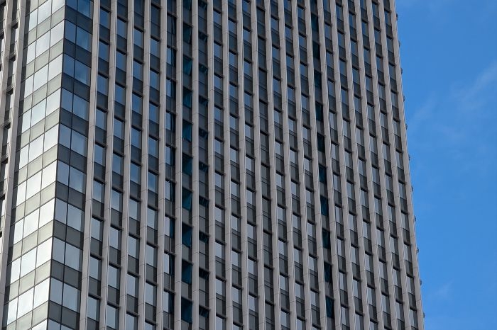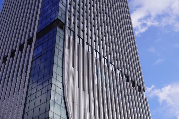 中層部分の外装カーテンウォールが、アールを描いて湾曲している点が特徴となっています。