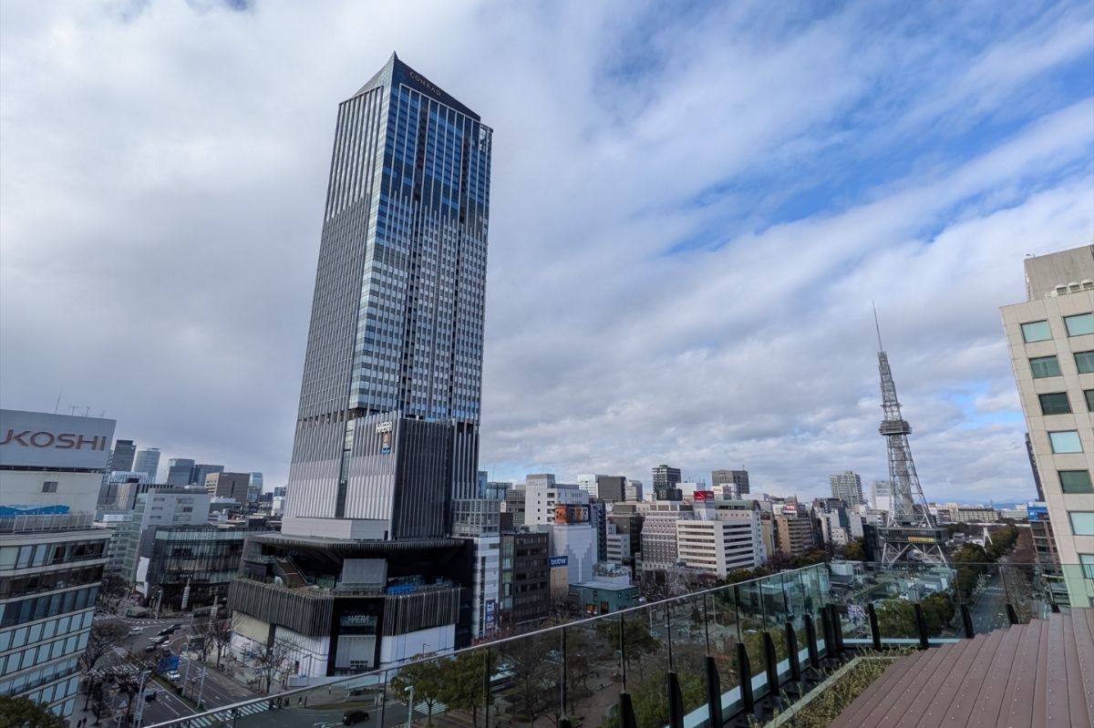 中日ビルの屋上広場から見た、建設中の「ザ・ランドマーク名古屋栄」と中部電力 MIRAI TOWER。2026年3月に竣工で、ついに栄にも中部電力 MIRAI TOWERを上回る高さの建物が誕生します。高さ200m超のスカイラインが、栄エリアに出現する瞬間が近づいています。