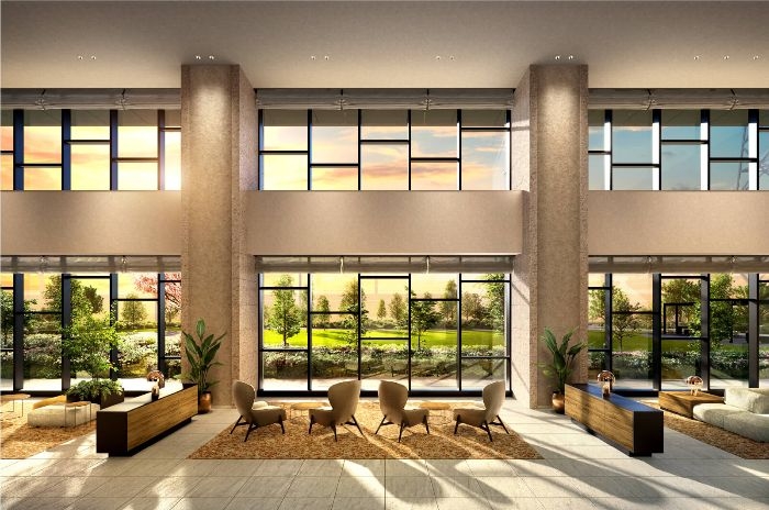 1階には「グリーンフォレスト」の風景と呼応する「グリーンコリドー」や「グランドホール」が広がります。グリーンコリドーでは、静けさと緑に包まれながら、公共からプライベート空間へと緩やかに導かれるような設計がなされています。グランドホールは2層吹抜けの開放感を持ち、「柳」と「桜」をモチーフにしたアートが迎賓の場に華を添えます。