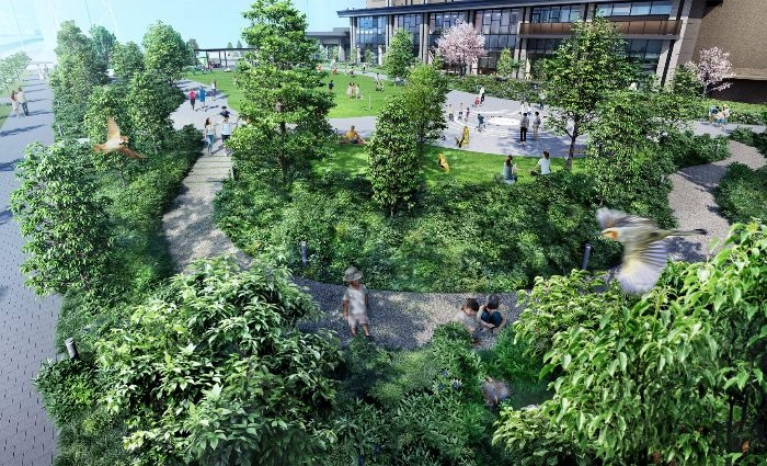 エリア最高層・最大級のスケールで建設されるウエリスタワー枚方樟葉では、生駒山系の森にインスパイアされた、4,000㎡を超える自然豊かな広大な広場「グリーンフォレスト」が設けられます。この取り組みにより、生物多様性への配慮が評価され、環境配慮型開発として「ABINC認証」を取得しています。