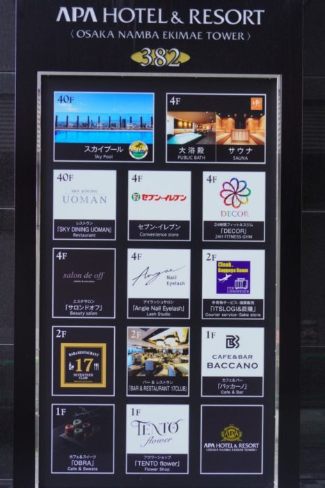 付帯施設は、1階にはロビーをはじめ、フラワーショップ「TENTO flower」、焼き菓子と和スイーツの店「OBRA」、カフェ&バー「バッカーノ(BACCANO)」があり、2階には手荷物サービスや酒類販売を行う「ITSLOGI&百陽」、直営レストラン「BAR&RESTAURANT 17CLUB」があります。4階には、サウナ付きの大浴殿・露天風呂「玄要の湯」やランドリーコーナー、24時間営業のコンビニ「セブンイレブン」、フィットネスジム「DÉCOR(デコール)」、まつげエステサロン「Angie Nail Eyelash」、エステサロン「salon de off」が揃っており、40階には展望レストラン「SKY DINING UOMAN」と、なんばエリアを一望できる展望プール「モンダミンプール」があります。