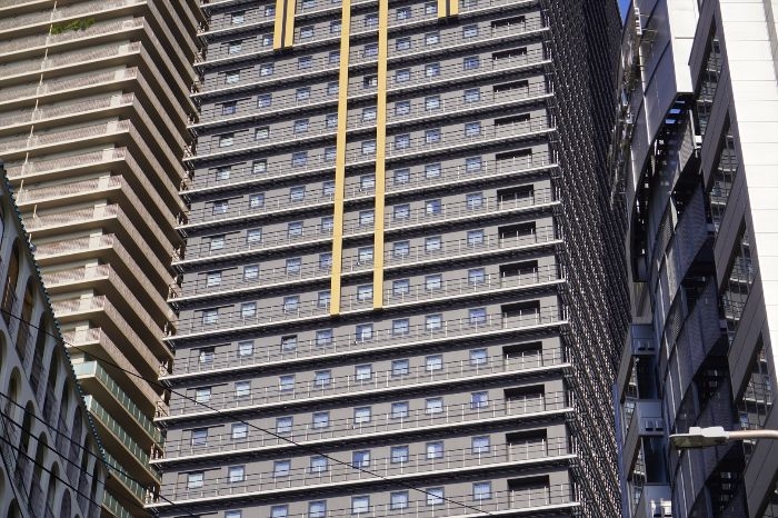 東側から見上げたアパホテル&リゾート〈大阪難波駅タワー〉の様子です。