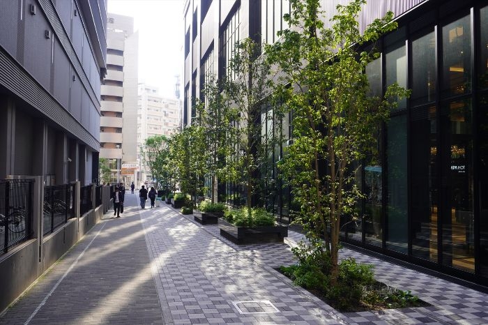 北側には歩行者専用通路に面して歩道状空地と緑地が整備されています。