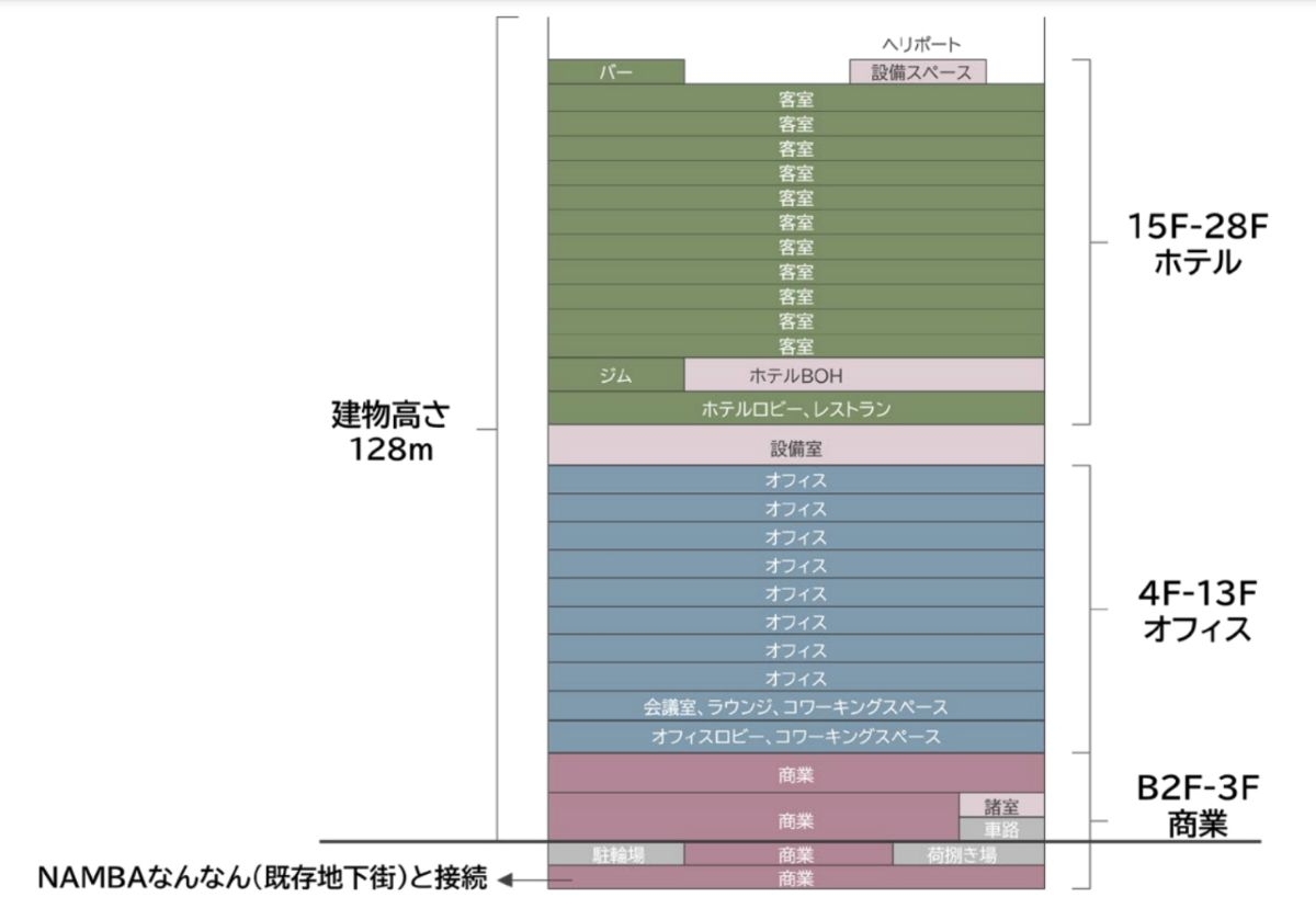 施設構成は、地下2階から地上3階に商業施設、地下1階に駐輪場および荷捌き場、4階から13階にオフィスが入り、4階にはオフィスロビーやコワーキングスペース、5階には会議室やラウンジ、コワーキングスペース、6階から13階にはオフィスが配置されます。14階には設備室、15階から28階にはホテル「ハイアット セントリック なんば 大阪」が入り、15階にホテルロビーやレストラン、16階にジムやホテルBOH、17階から27階に客室、28階にバーや設備スペース、ヘリポートが設けられます。
