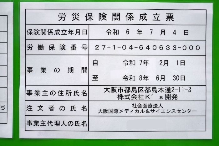 労災保険関係成立票には、解体工事期間が記載されており、2026年6月30日に解体工事が完了すると読み取れます。